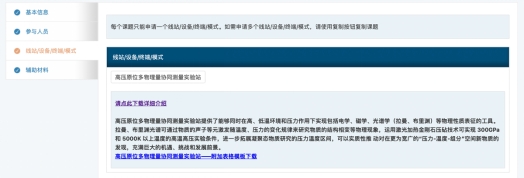 线站/设备/终端/模式:首先选择拟申请实验站,下方将显示实验站简要介绍。“请点击下载详细介绍”可下载该实验站详细文字和图片介绍。“XXX实验站-附加表格模板下载”为申请该实验所需的样品信息等表格。