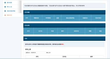 历史课题/历史成果:如在此平台中有使用中国科学院大科学装置填报的历史课题和历史成果,可读取选择,此两项将作为评审的参考。