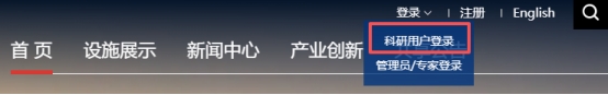 ①打开中国科学院重大科技基础设施共享服务平台:https://lssf.cas.cn,点击右上角“科研用户登录”,输入用户名和密码,点击登录。