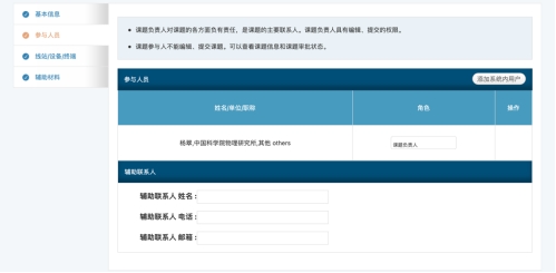 其他参与人员:可通过右上角“添加系统内用户”,选择已在平台注册的科研用户作为课题参与人。课题参与人不能编辑、提交课题,可以查看课题信息和课题审批状态。