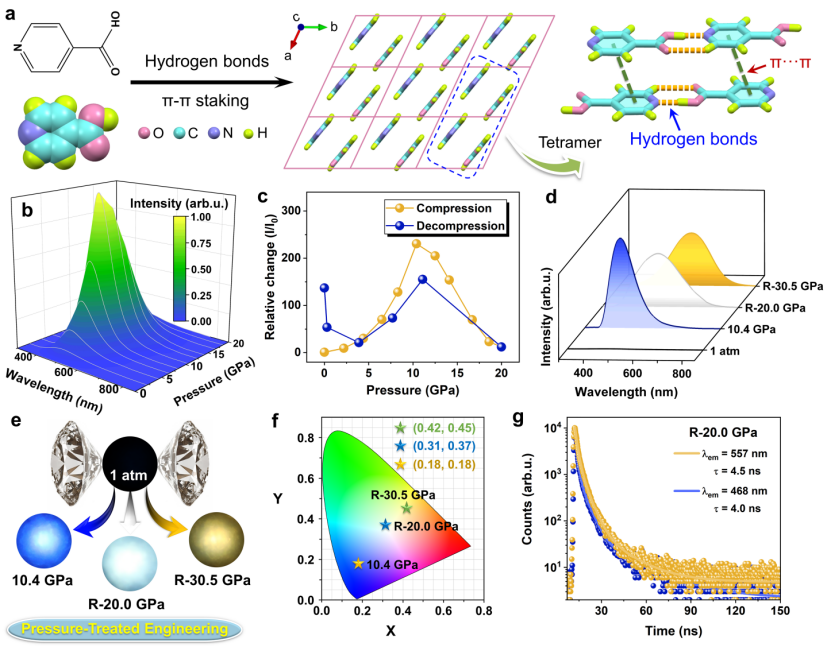近日,吉林大学高压与超硬材料全国重点实验室/综合极端条件高压科学中心杨新一教授课题组在有机分子的多色发光研究方面取得重要进展。提出利用压强工程调控初始不发光的异烟酸(INA)材料中分子间双电荷转移强度,实现从暗态到高质量多色发射(即蓝光、白光、黄光)的可控切换。相关研究成果以“Controllable multicolor emission from initially non-emissive organic molecules by pressure engineering”为题发表在《自然通讯》(Nat. Commun. 2025,16,8780)上。